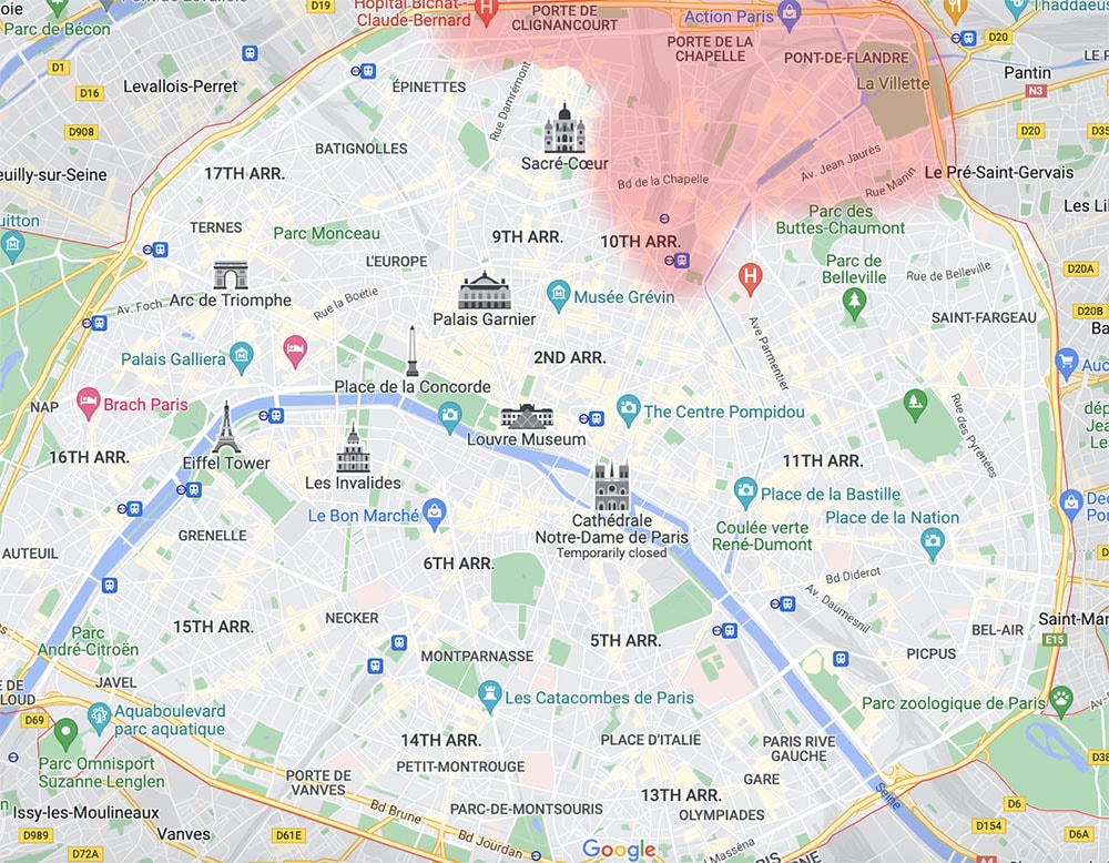 The 18th Arrondissement is home to the beautiful Montmartre neighborhood but the northern portion of the 18th can get a little sketchy. Much of the 19th Arrondissement (specifically around the Barbès–Rochechouart/Stalingrad/Jaures metro stations, Porte de la Chapelle, Marx Dormoy, La Chappelle, Porte de Clignancourt, and Porte de la Villette) can also feel unwelcoming to visitors—some pockets are perfectly fine but the area doesn’t feel like “classic Paris” so I wouldn’t recommend staying there anyways.